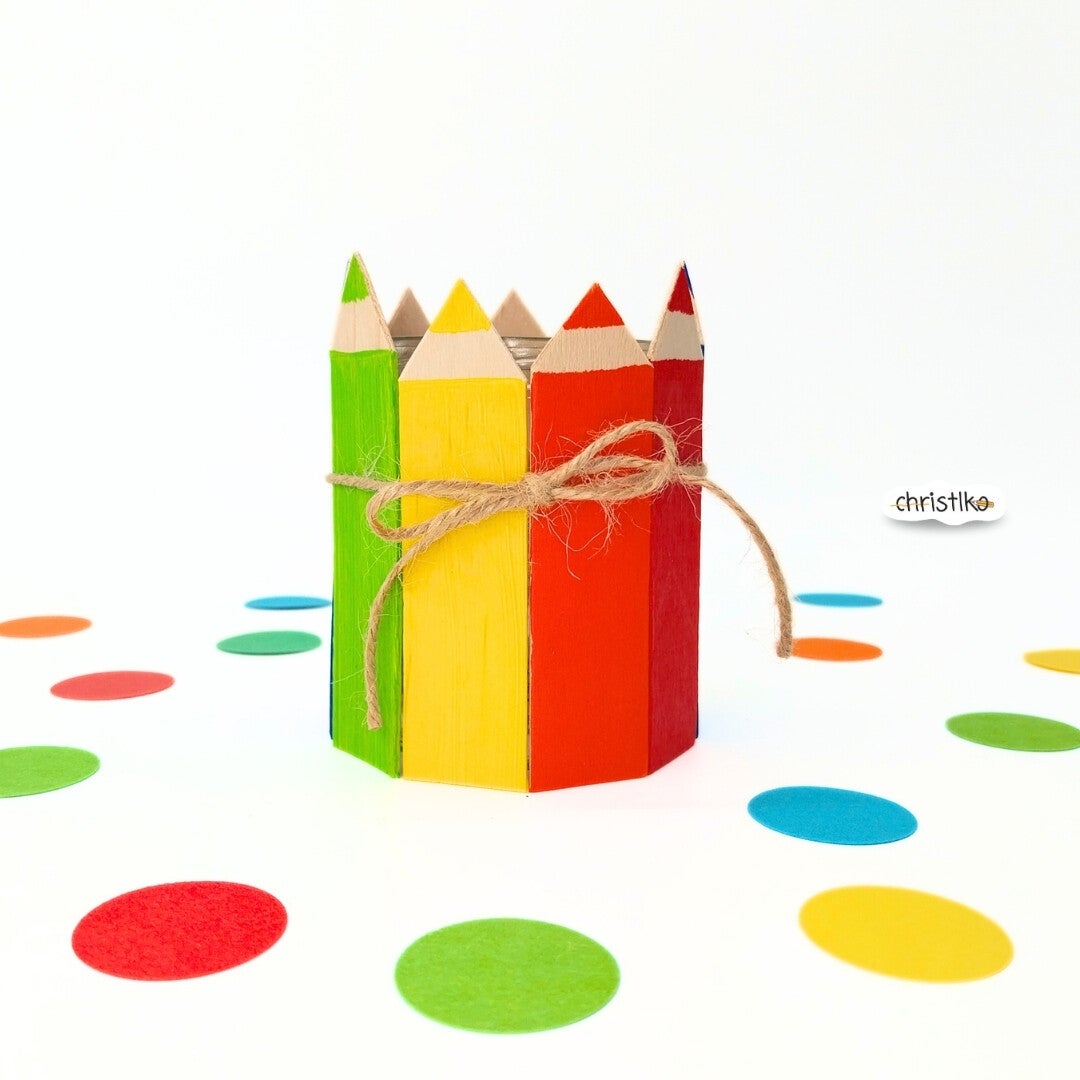 Perfekt als fröhliche Tischdeko zur Einschulungsfeier oder als liebevolles Geschenk für kleine Schulstarter*innen. Mit einem LED-Teelicht bringt es die bunten Stifte richtig schön zum Strahlen.